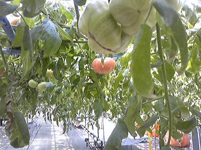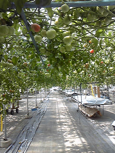 水気耕栽培「ハイポニカ」と言って、ハウスの中ではこれ本当にトマトの木?と思うほど、巨大なトマトの木が並んでいます。